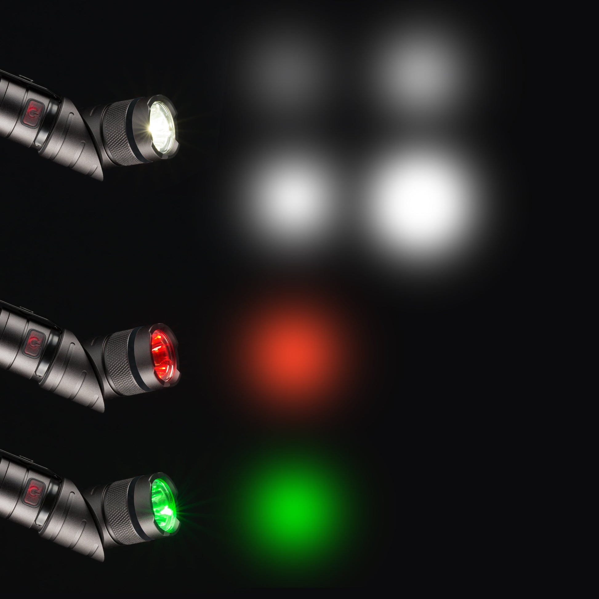 Modes: Lumière blanche, rouge et verte à différents niveaux de luminosité, clignotant